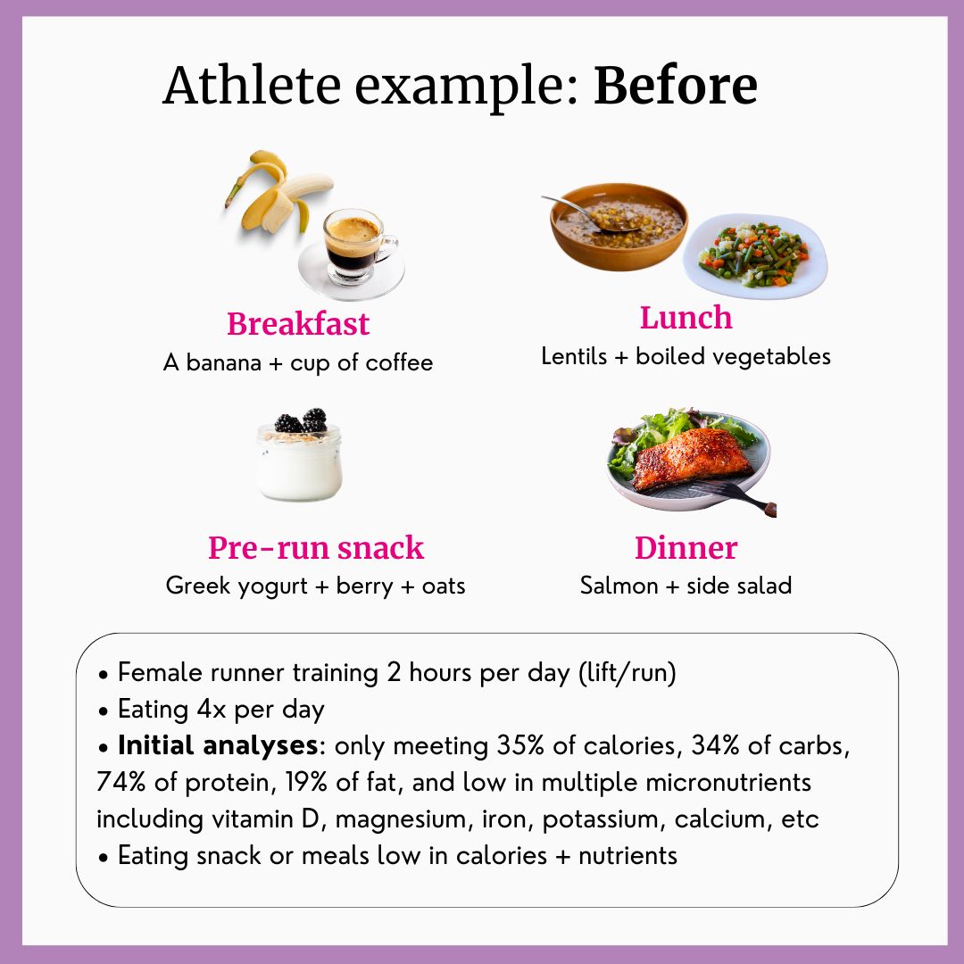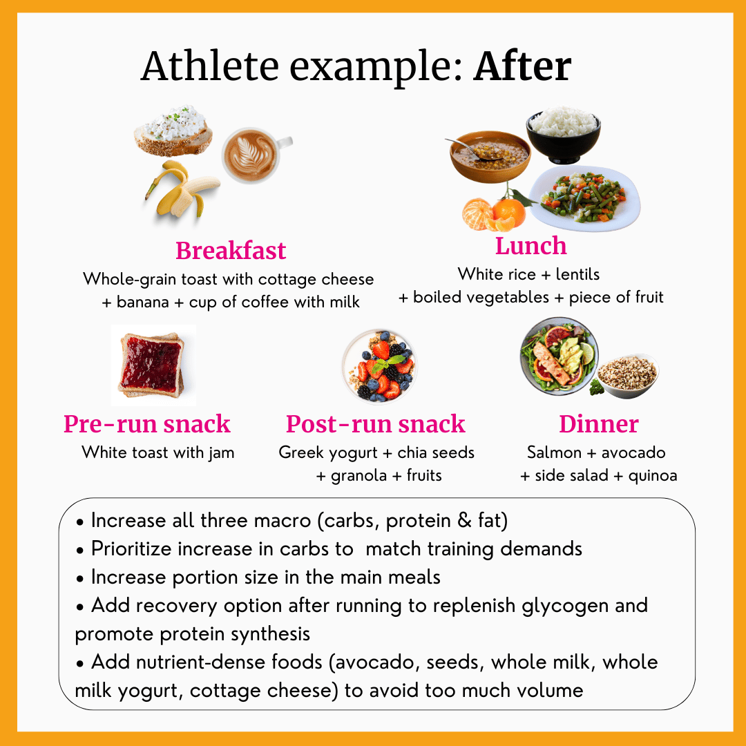 With a few small changes, we increased the energy density of this diet, adjusted the macronutrients, and included a recovery meal after long runs.