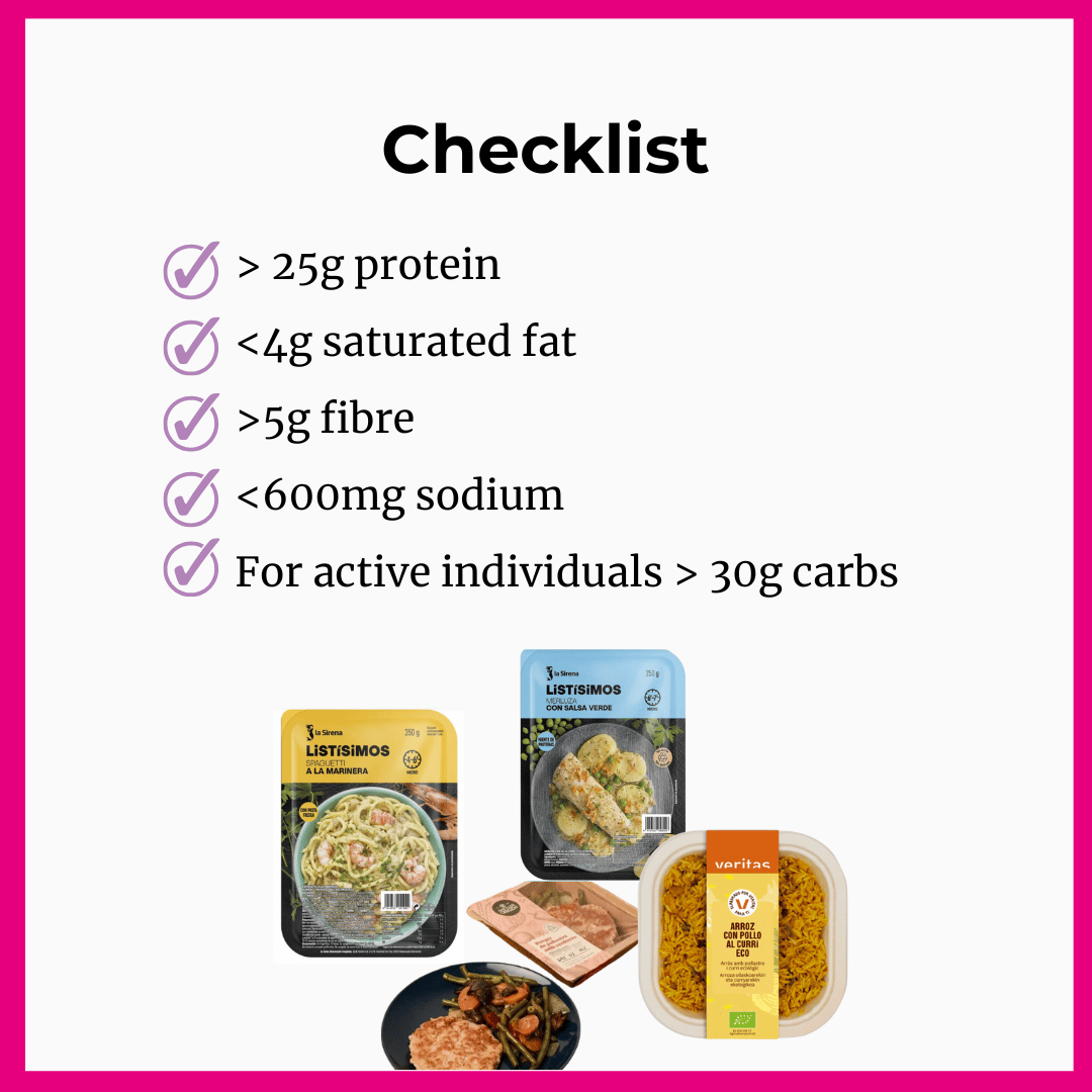 Here’s a little guideline of what to look for in pre-packaged meals for when it’s too difficult to cook at home.